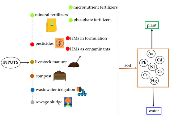 In addition, micronutrient fertilizers have also been identified as a source of HMs [17,24] (Table S1). Studies have reported the presence of variable concentrations of HMs—including arsenic (As), cadmium (Cd), chromium (Cr), nickel (Ni), lead (Pb), and mercury (Hg)—in various fertilizer inputs. Notably, limestone, commonly used in soil amendments, has also been shown to contain trace levels of these metals [25]. Nitrate fertilizers contain moderate Cd (0.05–8.5 mg kg−1) and Pb (2–120 mg kg−1) levels [26], while lime may have Pb up to 1250 mg kg−1 [26]. Hg has been detected in phosphatic fertilizers at levels up to 0.35 mg kg−1 [27], and the highest As concentration, 9.8 mg kg−1, was also reported in this category [28].