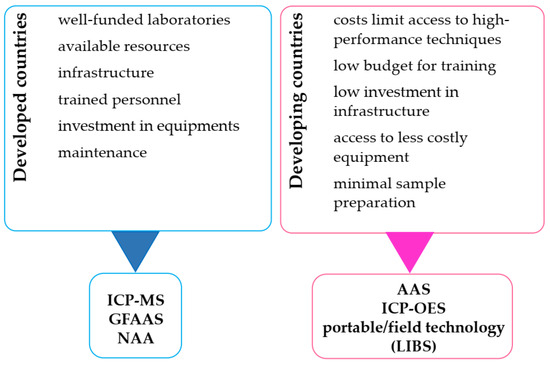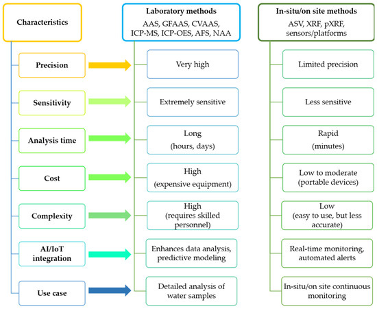 (f) Atomic fluorescence spectrometry (AFS) is a highly sensitive and selective technique used for the determination of trace metals in various samples, including water. It is based on the principle of atomic absorption and fluorescence emission. The assessment of As and Hg levels in surface and groundwater samples collected from East China was reported [78], with analysis performed using AFS. The level of As in groundwater ranged from 0.06 to 12 mg L−1, while Hg levels ranged from 0.0104 to 0.0497 mg L−1. In surface water, the As level was higher, reaching 71.3 mg L−1, and the Hg level was 0.0372 mg L−1.