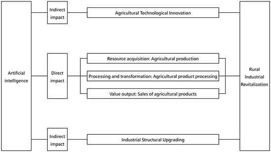 Rural industries rely on agricultural and rural resources, including agricultural production, agricultural processing, and agricultural sales. The primary sector covers farming, forestry, animal husbandry, and fisheries; the secondary sector involves the processing and manufacturing of agricultural products; and the tertiary sector includes distribution services, as well as cultural and tourism industries. Innovation theory emphasizes that the introduction of new technologies can play a revolutionary and propulsive role in traditional industries [19]. Under this theoretical lens, rural industries constitute a significant part of traditional industries. AI, as a key new technological element characterized by its intelligence, can be applied within the practical context of rural industries and integrated into each phase of their value chain [52]. When AI is involved, each link will have a significant positive impact. Therefore, this study explains the direct impact of AI on rural industrial revitalization from three dimensions: “resource acquisition”, “processing and transformation”, and “value output”.