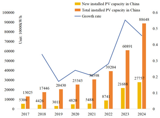 Currently, with the progress of the times and the rapid development of society, human beings’ demand for energy is increasing, while the limitations and environmental hazards of traditional fossil energy sources such as coal, oil and natural gas are becoming more and more prominent [1]. In this context, adjusting the energy structure and accelerating the development and utilisation of new energy sources has become a key path to cracking the energy crisis and achieving sustainable development [2]. According to the latest report released by the International Energy Agency (IEA), global renewable energy capacity additions rise to 700 GW in 2024, setting a new record for the 22nd consecutive year. Among them, solar energy, as a representative of clean and renewable new energy, has great potential and prospects [3]. In recent years, innovations in photovoltaic materials and device architectures have continuously driven industrial upgrades. Novel materials and structural designs have significantly improved the conversion efficiency and long-term stability of photovoltaic devices, providing a solid physical foundation for large-scale applications [4,5]. In 2024, the global new PV installed capacity is expected to exceed 550 GW, of which, China accounted for more than 50%, with an average growth rate of more than 35% [6]. Its growth trend is shown in Figure 1. As the installed capacity of PV increases year by year, the proportion of PV power generation in the power system is rising. Accurate and effective PV prediction results are important for the safe and stable operation of the power system.