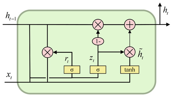 where zt is the update gate, rt is the reset gate, is the candidate hidden state, ht is the hidden state passed to the next moment, xt is the input at moment t, ht−1 is the state at moment t − 1, σ is the sigmoid function, tanh is the hyperbolic tangent function, and Wz, Wr and W are the weight vectors of the cyclic connection.