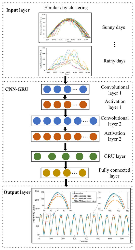 In this paper, we propose a PV power prediction model based on similar day clustering and CNN-GRU, which achieves scenario segmentation through weather clustering and combines feature preference with deep learning to achieve accurate predictions for different weather patterns. The model flow is shown in Figure 4, and the specific prediction steps are as follows.