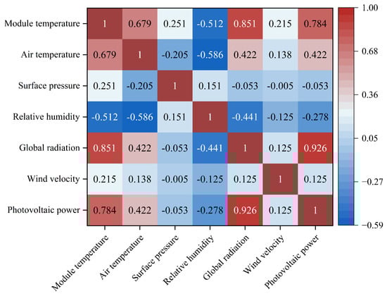 The Pearson correlation coefficient lies between [−1, 1], with positive values indicating a positive correlation and negative values indicating a negative correlation. The closer the absolute value is to 1, the stronger the correlation. The heat map of Pearson’s correlation coefficient between PV power and the factors is shown in Figure 5.