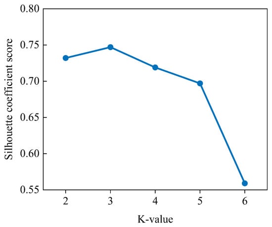 The pre-processed data were analysed using K-means clustering based on total solar radiation and cloud opacity. The K-means clustering algorithm is an iterative solving cluster analysis algorithm. The basic principle of the algorithm is to divide the dataset into K groups and randomly select K data objects as the initial clustering centroids. The distance between each data object and all initial cluster centroids is calculated, and each data object is assigned to the closest cluster centre based on the minimum distance principle. Each cluster centre and its assigned data objects together form a cluster. This process is iterated until the cluster centroids no longer change. To determine the optimal number of clusters, the value of K was set from 2 to 6, and the corresponding silhouette coefficients were calculated. The silhouette coefficient curve is shown in Figure 7. A higher silhouette coefficient indicates better clustering performance. The results show that the silhouette coefficient reaches its maximum when K = 3, suggesting that three clusters provide the most effective separation.