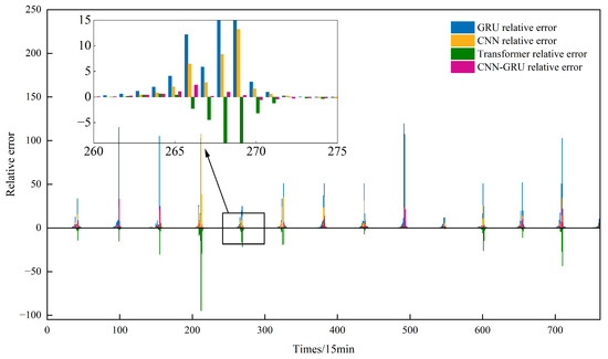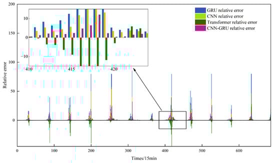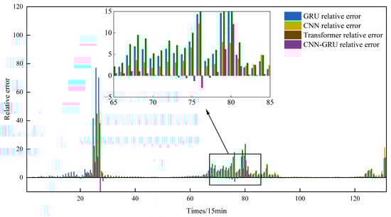 Figure 9b illustrates the prediction results under cloudy day conditions, where solar irradiance fluctuates significantly, leading to more pronounced differences in model performance. The GRU model exhibits a clear phase shift relative to the actual values and only captures the general trend of PV power variation, failing to reflect short-term fluctuations. The CNN model shows improved prediction accuracy due to its enhanced ability to extract local features through convolutional kernels. The CNN-GRU model, which integrates the strengths of both CNN and GRU, demonstrates a strong advantage in tracking sudden changes while maintaining the overall trend. Although the Transformer model can generally forecast the overall trend, its response to abrupt changes is slower than that of the CNN-GRU and CNN models, with accuracy slightly better than the GRU model.