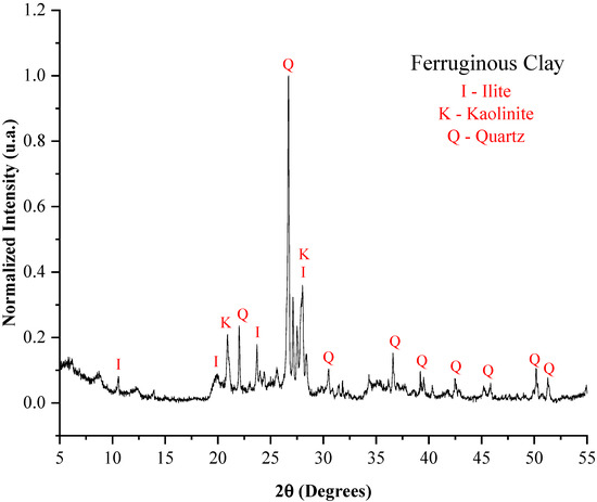The kaolinite found in the clays, the illite present in the ferruginous clay, and the halloysite identified in the kaolinitic clay are described as hydrated aluminum silicates, and their presence reflects the high concentrations of inorganic oxides (SiO2 and Al2O3). These minerals are significant in the production of lightweight aggregates due to the dehydroxylation process, which releases water in the form of vapor [36,37], contributing to pore formation.