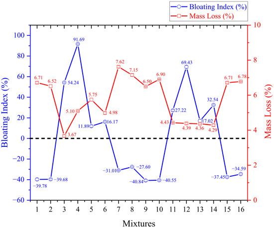 Figure 4, Figure 5 and Figure 6 refer, respectively, to the comparison between the bloating index and mass loss, specific gravity and crushing strength, and water absorption. The results are presented as mean values, and error bars were included in the figures to represent the measurement error limits.