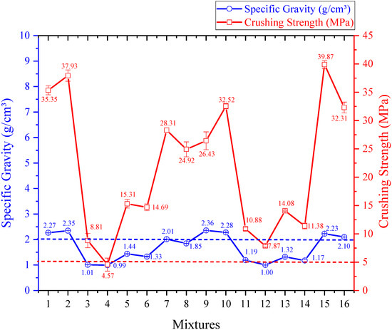 Figure 14, Figure 15 and Figure 16 present results for specific gravity, water absorption, and crushing strength as a function of the main variables identified through the Taguchi method.