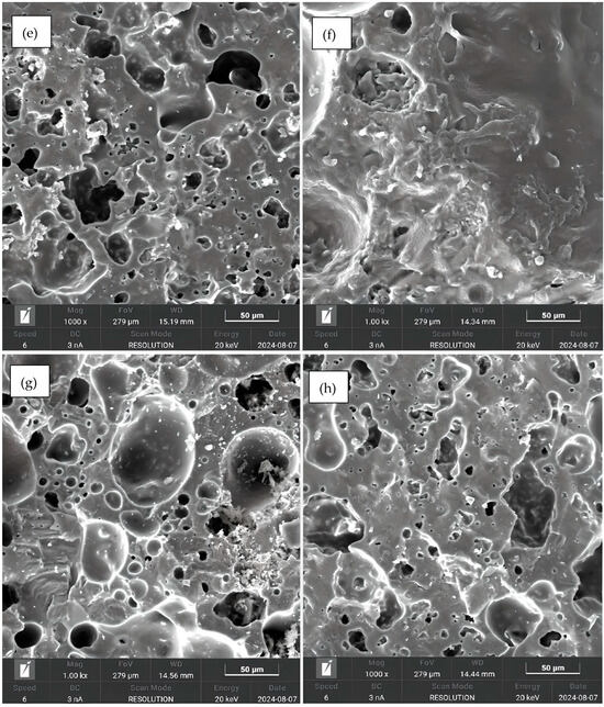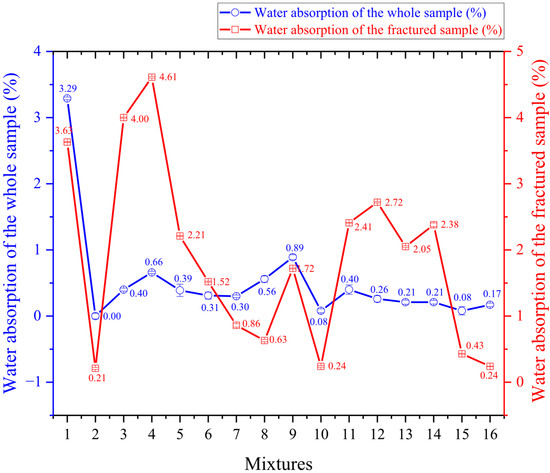The water absorption test (Equation (4)) was conducted based on an adaptation of NBR 6458 (ABNT, 2025) [41], in which the dry and saturated masses were measured. Measurements were taken on both whole and broken samples to assess the formation of a superficial impermeable layer and the connectivity of internal pores.