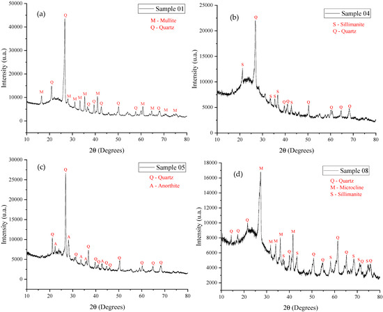 The presence of silica in all three raw materials (kaolinitic clay, ferruginous clay, and porcelain polishing residue), when sintered at high temperatures (above 1000 °C), can form quartz, which explains its presence in all the analyzed samples (all of which were sintered above 1000 °C).