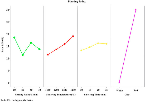 Initially, the Taguchi analysis was performed for each response defined in the experimental program (Table 2), where the control factors influencing each property were analyzed, obtaining the signal-to-noise ratios necessary to rank the parameters that impacted each specific property, along with their respective graphs, enabling the determination of the optimal levels of each factor to achieve the desired results. The signal-to-noise (S/N) ratio was used to analyze the effects that the factors proposed in Table 1 have on the final properties of interest in this study. The S/N ratios are divided into three categories: smaller is better, larger is better, and nominal is best. For the properties analyzed in this study, the following definitions were applied: bloating index and crushing strength were set as larger is better, while mass loss, specific gravity, and water absorption were set as smaller is better.
