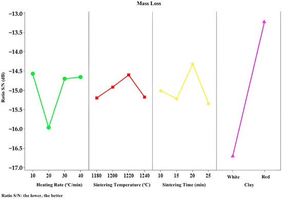 In the ANOVA test for mass loss (Table 6), it is noted that the ranking of the most influential factors to mass loss converges with the Taguchi method, resulting in the definition of the use of ferruginous clay, a heating rate of 10 °C/min, a sintering time of 20 min and a sintering temperature of 1220 °C.