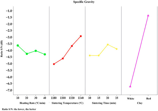 The Taguchi and ANOVA analyses once more converge in identifying the most influential parameters for this property. Therefore, the optimal combination for achieving lower specific gravity includes the use of ferruginous clay, since its chemical and mineralogical composition favors expansion and thus results in lower density; a sintering temperature of 1240 °C, which, like the clay type, is associated with greater expansion; a sintering time of 20 min, also favorable for expansion and reduced specific gravity; and a heating rate of 10 °C/min, which promotes greater expansion and lower density.