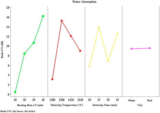 In the ANOVA test for water absorption (Table 8), it can be noted that the ranking of the factors with the greatest contribution to absorption closely resembles the order established by the Taguchi method, resulting in the optimal conditions of a heating rate of 40 °C/min, sintering temperature of 1220 °C, sintering time of 15 min, and the use of ferruginous clay.