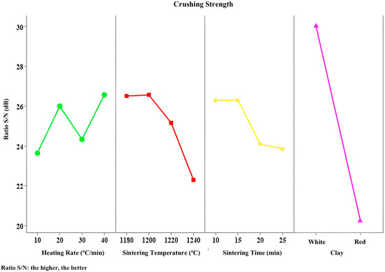 Finally, Table 9 shows the parameters that contributed most to the crushing strength, namely type of clay, followed by sintering time, sintering temperature, and heating rate, with the latter being the least influential factor.