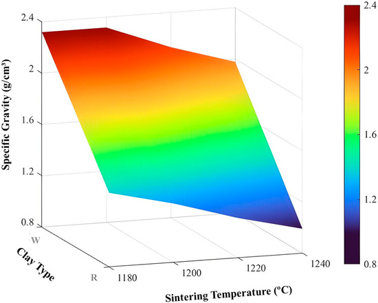 For specific gravity (Table 7), it is again observed that the parameter with the most significant influence was the type of clay, followed by sintering temperature.