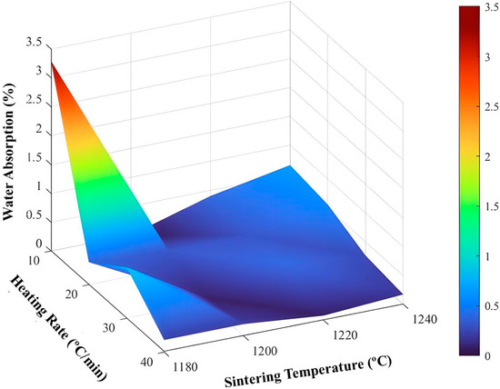 Figure 15 shows that, in general, regardless of the heating rate and sintering temperature used, water absorption remains at low levels.
