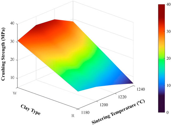 The analyses closely align in identifying the most influential parameters for this property. Thus, the ideal combination to achieve higher crushing strength involves the use of kaolinitic clay, because due to its low content of fluxing oxides, the material undergoes shrinkage and becomes denser, which enhances strength; a sintering temperature of 1200 °C, since lower temperatures inhibit pore formation, increasing density and strength; a heating rate of 40 °C/min, because a faster rate can cause the collapse of any developing porous structure, resulting in a denser material; and a sintering time of 10 min, as shorter times may limit full pore development, thereby increasing the density and strength of the material.