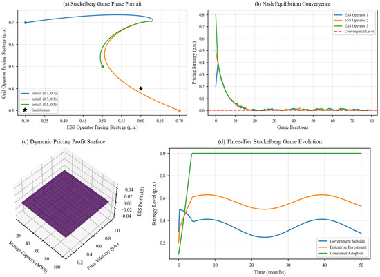 Mathematical formulation of game-theoretic ESSt optimization: The formal representation of energy storage game-theoretic optimization extends beyond basic game theory to incorporate specific energy system constraints: G = (N, S, U, Φ, Θ), where N = {1, 2, …, n} represents the set of energy storage agents; S = S1 × S2 × … × Sn represents the joint strategy space; U = (u1, u2, …, un) represents utility functions incorporating energy costs, grid services revenue, and system reliability metrics; Φ represents the set of physical constraints (power limits, energy capacity, grid connection limits); and Θ represents temporal constraints and market mechanism rules. This formulation enables rigorous analysis of strategic interactions while incorporating the physical and economic realities of energy storage operation.