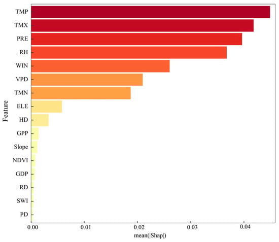 - Meteorological data, including average air temperature (TMP), maximum air temperature (TMX), minimum air temperature (TMN), wind speed (WIN), relative humidity (RH), total precipitation (PRE), were obtained from national-level surface meteorological observation stations. These data were screened according to the proportion of missing elements (not higher than 5%) during the study period at each station. After screening, the remaining 2207 valid stations were corrected for anomalies and missing values and interpolated via multilinear regression analysis [34]. The vapor pressure deficit (VPD), which can be directly calculated from the temperature, indicates the extent to which the actual air is far from the water vapor saturation state, i.e., the degree of atmospheric aridity [35], and was obtained via empirical formulae [36].