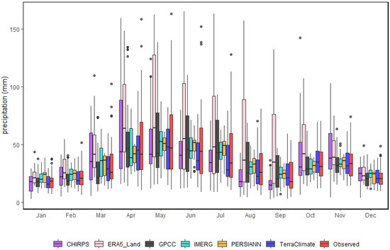 The long-term analysis of monthly mean precipitation (Figure 3) reveals distinct seasonal patterns across both ground-based observations and satellite-derived datasets in the basin. Observational data indicate that precipitation peaks during the warm season, particularly from April to June, followed by a gradual decline from July to September, and winter months (December to February). All satellite and reanalysis datasets successfully capture this general seasonal cycle; however, notable discrepancies remain in terms of magnitude and timing. For instance, GPCC and CHIRPS exhibit strong agreement with in situ observations during the peak precipitation months, accurately representing both seasonal peaks and transitions. In contrast, ERA5_Land and PERSIANN systematically overestimate monthly precipitation during spring and early summer, but winter estimates align more closely with observed values.