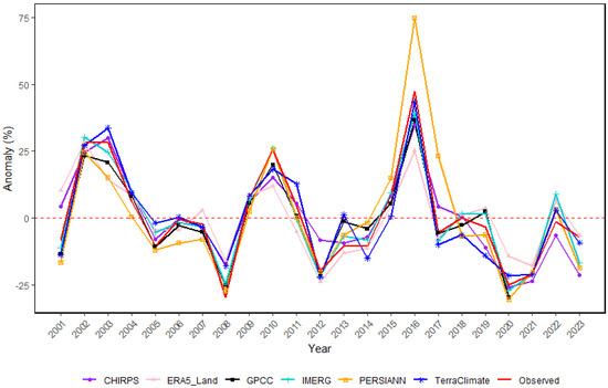 Annual precipitation anomalies relative to the 2001–2023 mean for observed data and various precipitation products.