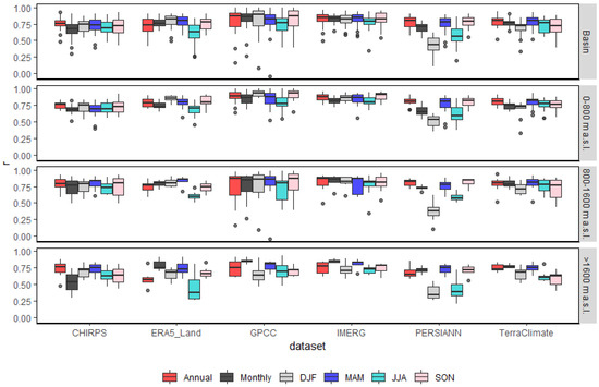 Median correlation coefficients (r) of different precipitation datasets in relation to station observations across temporal and spatial scales. The number of stations in the entire basin, 0–800 m, 800–1600 m, and >1600 m elevation ranges is 30, 15, 8, and 7, respectively.