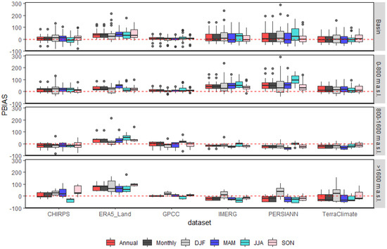 Median PBIAS (%) of different precipitation datasets in relation to station observations across temporal and spatial scales. The number of stations in the entire basin, 0–800 m, 800–1600 m, and >1600 m elevation ranges is 30, 15, 8, and 7, respectively.