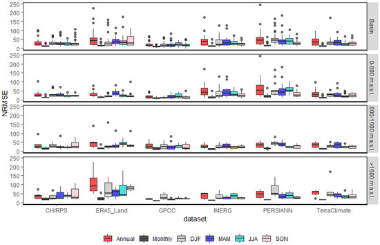 NRMSE (%) of different precipitation datasets in relation to station observations across temporal and spatial scales.
