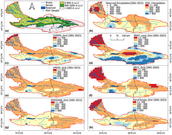 (a) Elevation range of the Ili River Basin; (b) average annual observed precipitation; (c–h) average annual precipitation from CHIRPS, ERA5_Land, IMERG, GPCC, PERSIANN, and TerraClimate datasets. All panels include observed station-based average annual precipitation (2001–2023), represented by triangles for comparison.