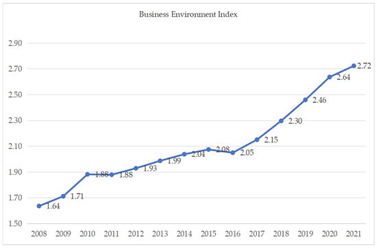 Economic globalization is encountering significant challenges during the post-pandemic recovery phase, particularly the increasing prevalence of protectionism and unilateralism. The evolving geopolitical landscape, characterized by deglobalization trends and techno-economic fragmentation, has precipitated systemic volatility in China’s industrial upgrading processes, which has affected the multilateral recovery framework led by the World Trade Organization. The Chinese economy has transitioned into a “new normal” phase, shifting from high-speed expansion to a more sustainable and higher-quality development path. Many studies have shown that a favorable business environment can promote economic growth [,,,,]. It plays a central role in shaping social capital flows and driving economic progress, acting not only as a significant factor but also a crucial determinant of these processes []. The Chinese government has prioritized the business environment as a key driver of sustainable development. In recent years, it has implemented a series of reforms focusing on simplifying administrative procedures, reducing enterprise burdens, and improving administrative efficiency and transparency. These initiatives aim to create a more favorable operating environment for market entities and have achieved remarkable results. According to the World Bank’s Doing Business Report, China has become one of the most open economies and significantly improved its global ranking in the world. This progress demonstrates the government’s commitment to building a more favorable business environment that supports enterprise growth and innovation.