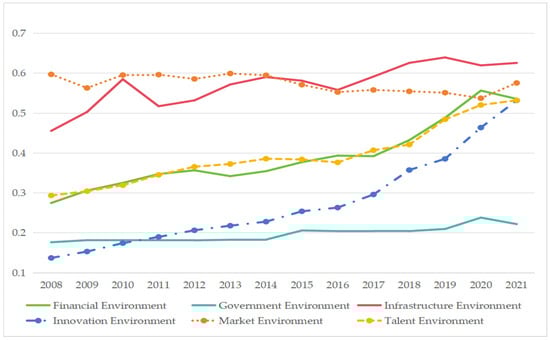 As shown in Figure 2, from a dimensional view, the indices related to the innovation environment, talent environment, and financial environment have exhibited relatively rapid development. Specifically, the innovation index experienced a significant increase from 0.087 in 2008 to 0.482 in 2021, reflecting a total growth of 0.395, with a particularly marked acceleration following its lowest value in 2008. Similarly, the talent environment index in the Greater Bay Area exhibited steady growth, rising from 0.244 in 2008 to 0.482 in 2021, demonstrating a cumulative growth of 0.239. The financial index showed consistent growth, climbing from 0.225 in 2008 to 0.486 in 2021, with a total growth of 0.261.