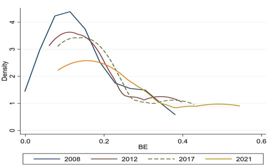 (5) The government environment is a comprehensive concept that encompasses government quality, responsiveness, and efficiency. As a critical institutional player in market economies, the government undertakes important functions such as strategic planning, resource allocation, public service provision, and regulatory supervision. These activities directly shape urban business ecosystems and enhance market efficiency []. This paper indicates that better business environments not only enhance public confidence in governance systems but also foster a positive cycle between institutional trust and citizen well-being.