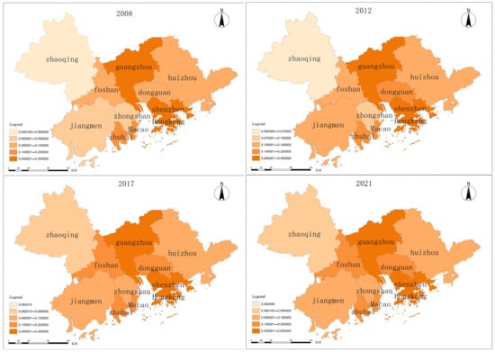 Building upon the evaluation paradigms from prior studies, this research applies the entropy weight method to quantify the business environment development from 2008 to 2021. The evaluation system adopts a multi-dimensional framework that incorporates indicators such as innovation capacity, market dynamism, talent attraction, financial development, governance efficacy, and infrastructural investment, constructing a comprehensive business environment development index. The spatial and temporal patterns of this index are visually depicted through GIS mapping in Figure 1, revealing distinct regional development patterns within the GBA.