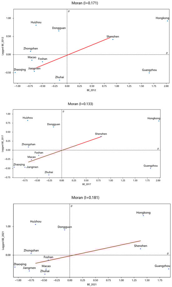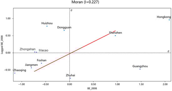 Spatial autocorrelation analysis is an important statistical technique employed to identify clustering patterns and regional disparities. By quantifying spatial distribution characteristics, this method enables the effective identification of core–periphery structures within geographic regions, thereby offering a theoretical foundation for the interpretation of spatial phenomena. Moran initially introduced the Moran’s I statistic as a measure of spatial autocorrelation []. Subsequently, some scholars expanded upon this framework by proposing the concepts of global and local spatial autocorrelation analyses. Specifically, the global Moran’s I index assesses overall spatial clustering tendencies across the entire study area, whereas the local Moran’s I index facilitates the detection of localized clusters and spatial heterogeneity. The spatial autocorrelation analysis reveals core–periphery structures and spatial clustering. The research finds that this method provides a solid basis for regional coordinated development, helping policymakers to optimize resource allocation and improve regional performance []. In business environment research, this analytical approach effectively uncovers spatial agglomeration effects and highlights the radiating influence and developmental impact of core urban centers on surrounding regions. For instance, in the Greater Bay Area, spatial autocorrelation analysis can clearly delineate the spatial clustering characteristics of the business environment within the Pearl River Estuary region, thereby providing robust scientific support for the formulation of regional coordinated development strategies.