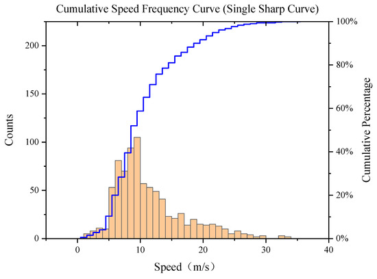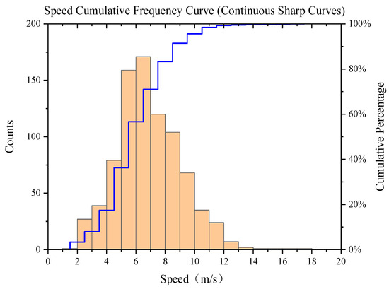 To more intuitively illustrate the differences in vehicle speed between single-curve and continuous-curve road segments, we plotted cumulative frequency distribution diagrams of acceleration and speed (see Figure 1, Figure 2, Figure 3 and Figure 4). In the figures, the blue curve represents the cumulative frequency of the current samples, while the orange histogram indicates the number of samples within each interval. The distribution characteristics in the figure clearly show that the acceleration distribution for a single curve is widespread, with a large range, whereas the acceleration for continuous curves is more concentrated, with a smaller range. Similarly, the speed distribution for a single curve is also wide, with a large range, while the speed for continuous curves is more concentrated, with a smaller range. The vehicle speed and acceleration on single curves are significantly higher than those on continuous curves. This indicates that the type of curve has a significant impact on vehicle dynamics. Roads with single curves typically allow vehicles to maintain higher speeds and accelerations, while roads with continuous curves force vehicles to reduce speed to ensure safety.