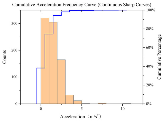 Cumulative frequency curve of acceleration for continuous sharp curve highway dataset.