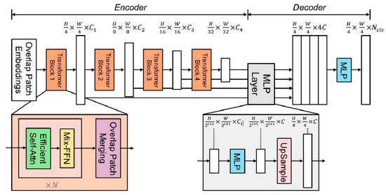 SegFormer is an efficient image segmentation model based on the Transformer architecture. Compared with CNN-based models such as U-Net, it demonstrates superior performance in complex scenarios, such as traffic environments. It utilizes multi-scale feature fusion and a lightweight design, ensuring high accuracy while reducing computational costs. In this study, Segformer is applied to the road segmentation task. The specific hyperparameter settings are shown in Table 4, and the model architecture is illustrated in Figure 5. The results of the image segmentation are displayed in Figure 6 and Figure 7.