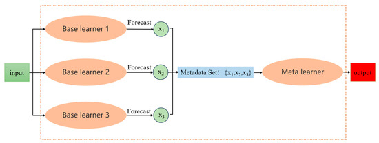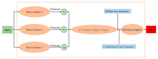 where denotes the true value; denotes the weight given to the prediction result of the first base learner; denotes the weight given to the prediction result of the second base learner; denotes the weight given to the prediction result of the third base learner; denotes the prediction result of the first base learner; denotes the prediction result of the second base learner; and denotes the prediction result of the third base learner’s prediction result.