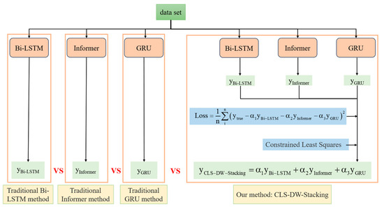 This study selects three models—Bi-LSTM, Informer, and GRU—that have shown excellent performance in traffic flow and other time series data modeling as base learners and constructs a unique methodology called CLS-DW Stacking. Unlike traditional stacking strategies, where the meta-learner learns from the output training set of base learners using machine learning, our method innovatively integrates the predictions of each base learner, reasonably allocates weights to minimize loss, and ultimately yields the optimal prediction results. Compared to traditional methods, which can lead to information loss and overlook predictions from certain base learners during the meta-learning process, our approach demonstrates significant advantages in generalization ability and enhances model interpretability to some extent.