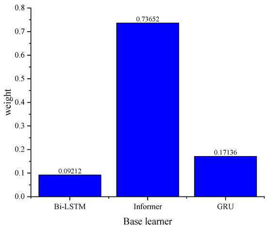 According to the dynamic weight allocation method, weights are assigned to the three base learners, Bi-LSTM, Informer, and GRU. The weight allocation is shown in Figure 13.