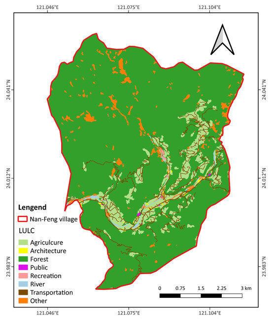 LULC classification map of Nanfeng Village, delineated by the red boundary. The map shows categories including agriculture, architecture, forest, public facilities, recreation, river, transportation, and other land uses.