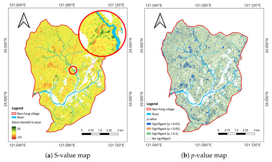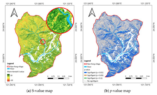 MK trend analysis of Pléiades imagery (2019–2023) for Nanfeng Village, Jenai Township, showing (a) an S-value map representing the direction and magnitude of trends, and (b) a p-value map identifying areas of statistical significance.