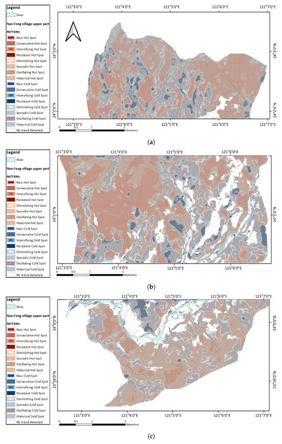 Spatial distribution of NDVI hot and cold spot patterns in Nanfeng Village, Jenai Township, categorized into (a) upper, (b) middle, and (c) lower regions. The maps illustrate different temporal trend types, including new, consecutive, intensifying, persistent, diminishing, sporadic, oscillating, and historical hot or cold spots, as well as areas with no detected trend.