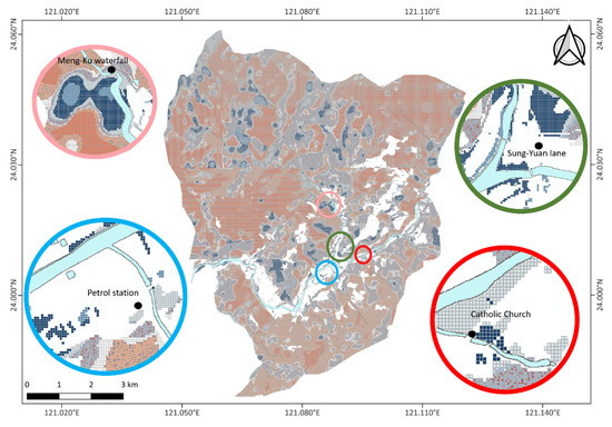 The comprehensive hot and cold spot classification map (Figure 6) integrates the results from the upper, middle, and lower sections of Nanfeng Village into a single, continuous depiction of NDVI temporal patterns from 2013 to 2023. By combining intensifying, new, persistent, oscillating, and diminishing hot and cold spots into a unified framework, the map provides a clear overview of spatial relationships across the entire study area. This integrated perspective highlights the transition from the forest-dominated upper section to the more mixed vegetation patterns of the middle and lower sections, reflecting variations in both vegetation gains and losses. Insets focus on key landmarks—Mengku Waterfall, Sung-Yuan Lane, the Catholic Church, and a gas station—capturing localized patterns of vegetation change linked to both natural processes and human activities.