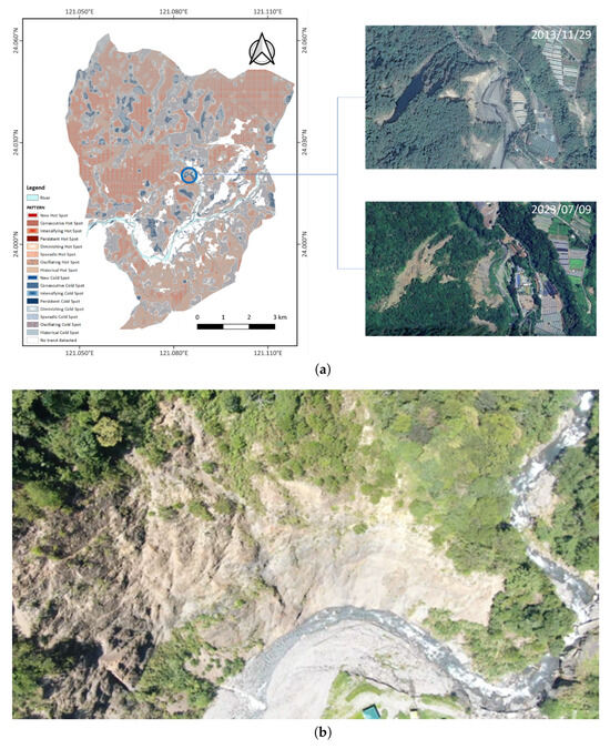 Comparison of remote-sensing analysis and field observations at the Mengku Waterfall slope. (a) NDVI hot- and cold-spot patterns derived from SPOT imagery (2013–2023) for Nanfeng Village, shown alongside a Google Earth Pro image of the slope near Mengku Waterfall to highlight the visual correspondence with identified areas. (b) UAV photograph of the slope adjacent to Mengku Waterfall, taken in 2023 following Typhoon Khanun, showing terrain disturbance and vegetation loss.