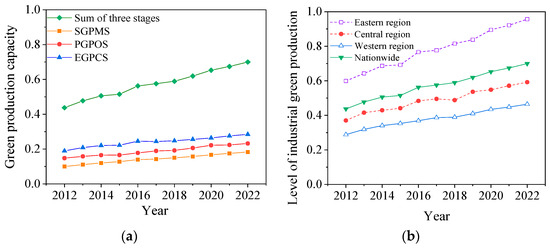 The evolutionary trend of industrial green production capacity is shown in Figure 1. Overall, industrial green production capacity increased rapidly from 0.437 to 0.700 during the study period, with a cumulative increase of 59.89%. The changes in industrial green production capacity regarding the subsystems are shown in Figure 1a. The results demonstrate that the industrial green production capacity of each subsystem exhibited the characteristics of EGPCS > PGPOS > SGPMS. From the empirical data in 2022, the compositional percentage of industrial green production capacity showed that the EGPCS subsystem had the highest percentage at 40.62%, while the EGPCS subsystem had the lowest percentage at 26.19%. This phenomenon was closely related to the payback period and environmental regulation. Specifically, SGPMS had a short payback period and fast short-term returns, while EGPCS had the longest payback period and a high investment threshold for green transformation. Under the pressure of environmental regulation, industrial enterprises tended to prioritise the improvement of SGPMS [51]. Figure 1b shows the changes in industrial green production capacity by region. The results indicate that green production capacity in industry was highest in the eastern region and lowest in the western region, which was strongly related to the industrial structure and energy consumption structure [60,61]. Compared to the western region, the eastern region had a better industrial structure and energy consumption structure. The eastern region was dominated by the service industry, with the tertiary industry accounting for 52.3%, while the western region was dominated by heavy industry, with the secondary industry accounting for 43.7%. Coal consumption in the western region accounted for 72.4%, while in the eastern region, the corresponding value was 49.8%. In addition, the proportion of renewable energy consumption in the eastern region was 26% higher than that in the western region. Therefore, the eastern region was superior in industrial green production.