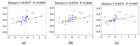 Moran scatterplot of synergistic effects in industrial green production (2012, 2017, and 2022). (a) Y2012; (b) Y2017; (c) Y2022.