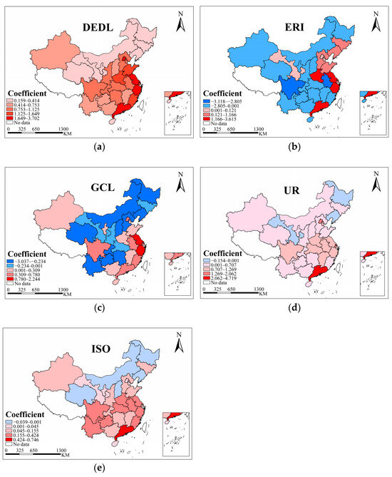 Spatial distribution of the regression coefficients of the GWR model. (a) The level of digital economy development (DEDL); (b) The intensity of environmental regulation (ERI); (c) The level of green credit (GCL); (d) The urbanisation level; (e) the optimisation of industrial structure (ISO).