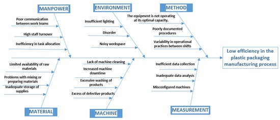 The methodology used to diagnose the problem of low efficiency in the production of plastic packaging includes several tools and techniques used to identify the root causes. Initially, information was gathered on the production process by measuring data on machine performance, quality, and availability. Subsequently, overall equipment efficiency (OEE) Analysis was used for each area of the company, which allowed the identification of the areas with the highest inefficiency and the underlying causes.